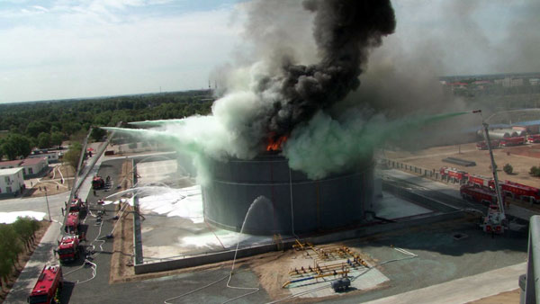 黑龍江省公安消防總隊大型油罐火災(zāi)撲救跨區(qū)域?qū)崙?zhàn)拉動演練